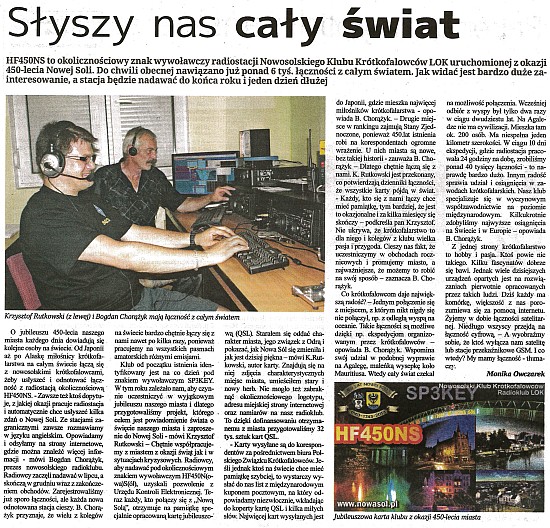 Autor: Krzysztof SQ3JPDNowosolski Klub Krótkofalowców SP3KEY pragnąc aktywnie uczestniczyć w obchodach 450-lecia powstania Nowej Soli uruchomił radiostację pracującą pod okolicznościowym znakiem wywoławczym HF450NS.