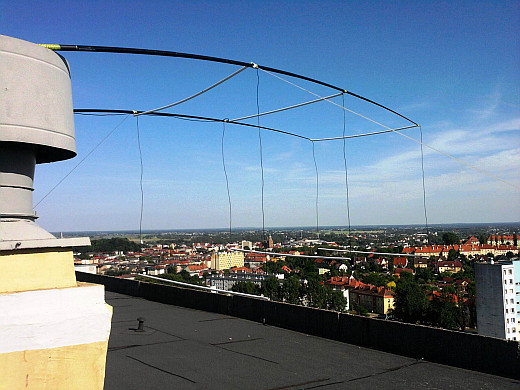 Zainstalowałem antenę tym razem na dachu wieżowca (33m up.). Niestety okazało się, że teraz antena nie pracuje tak dobrze jak na wysokości III pietra (12m up.) Instalacja anteny na balkonie powodowała, że antena wisiała w wolnej przestrzeni, a na dachu jest tylko ok. 1,5m nad dachem żelazobetonowym.