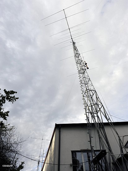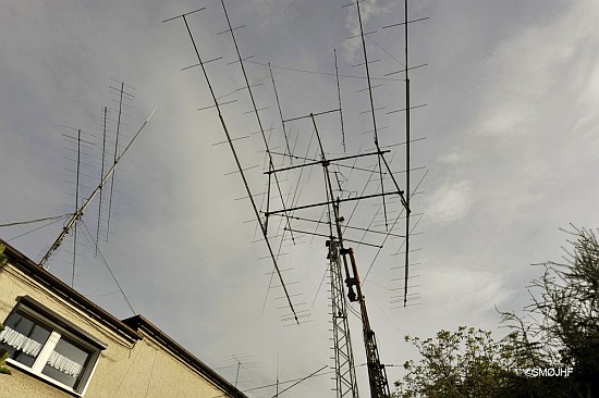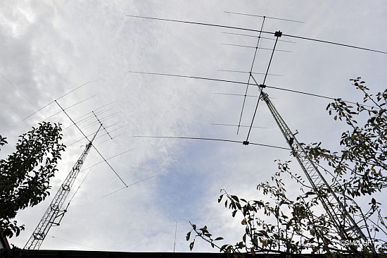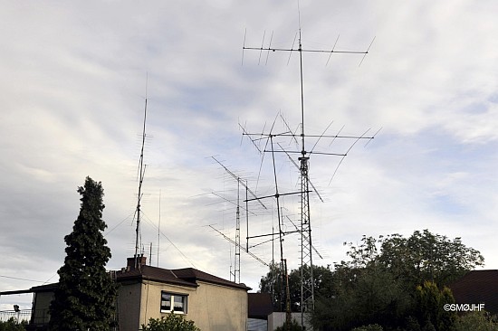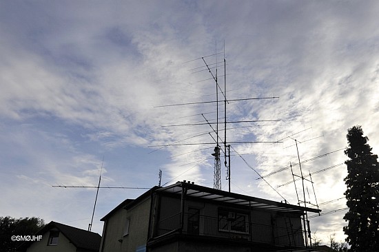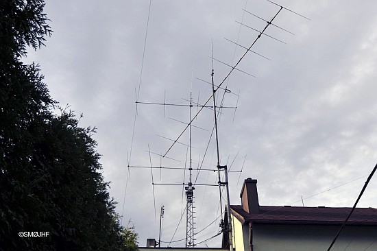 Niemniej, zestaw anten kolegi Piotra jest imponujący. Jest to także jedna z trudniejszych do sfotografowania farm antenowych. Anteny stoją blisko budynków, a budynków jest kilka. Tuzin fotografii, mam nadzieję, odda jednak obraz aluminiowo-stalowego lasu wśród drzew i zabudowań.