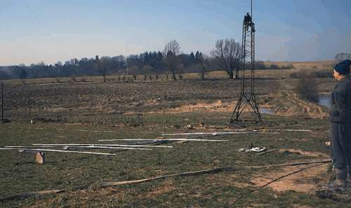 Po powrocie do domu już późną nocą usypiam w fotelu, budzi mnie XYL około godz. 5 rano. Zmieniam polaryzację z pionowej na poziomą na jeszcze 3 godziny. Nie wiem kiedy zasypiam. Budzę się o 8 godzinie bo o 9 godzinie spotykamy się planowo w Koniewie i składamy antenę na 28 mhz. Dojeżdżam na miejsce, zgodnie z ustaleniem na miejscu są Romek SP4JCP, oraz Wojtek SQ4MP( gospodarze terenu ). W ciągu 1,5 godziny antenę mamy poskładaną i gotową do postawienia na kracie ( antena wykonana jest w naszej opinii z dużą kulturą techniczną, dokładnością, oraz estetyką jeszcze raz TNX Jurek SP3GEM). Jeszcze ,,tylko"" Wojtek SQ4MP, jeden z członków ekipy ,,spider man'' zamocował antenę na jednym segmencie kraty i temat był załatwiony.