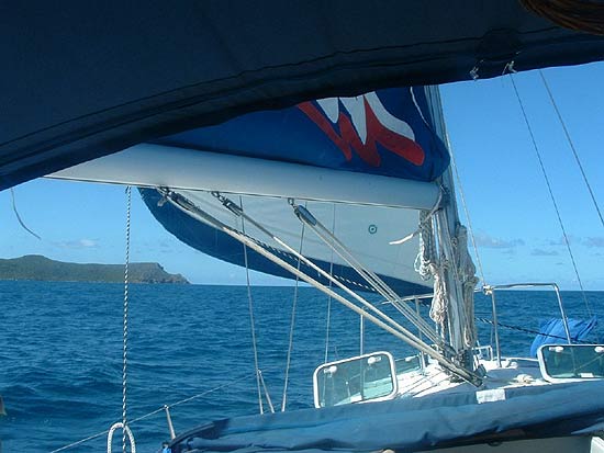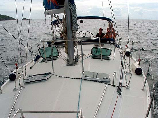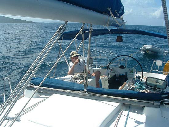 Odpływamy w stronę wyspy Virgin Gorda około 40km. Pogoda niezła. Wreszcie zaczyna trochę wiać. Pełne żagle - jest cudownie. Wszyscy się opalają, dziewczyny przygotowują lunch. Problem jest taki, że im zaczyna dokuczać choroba morska, jak tylko zejdą pod pokład.